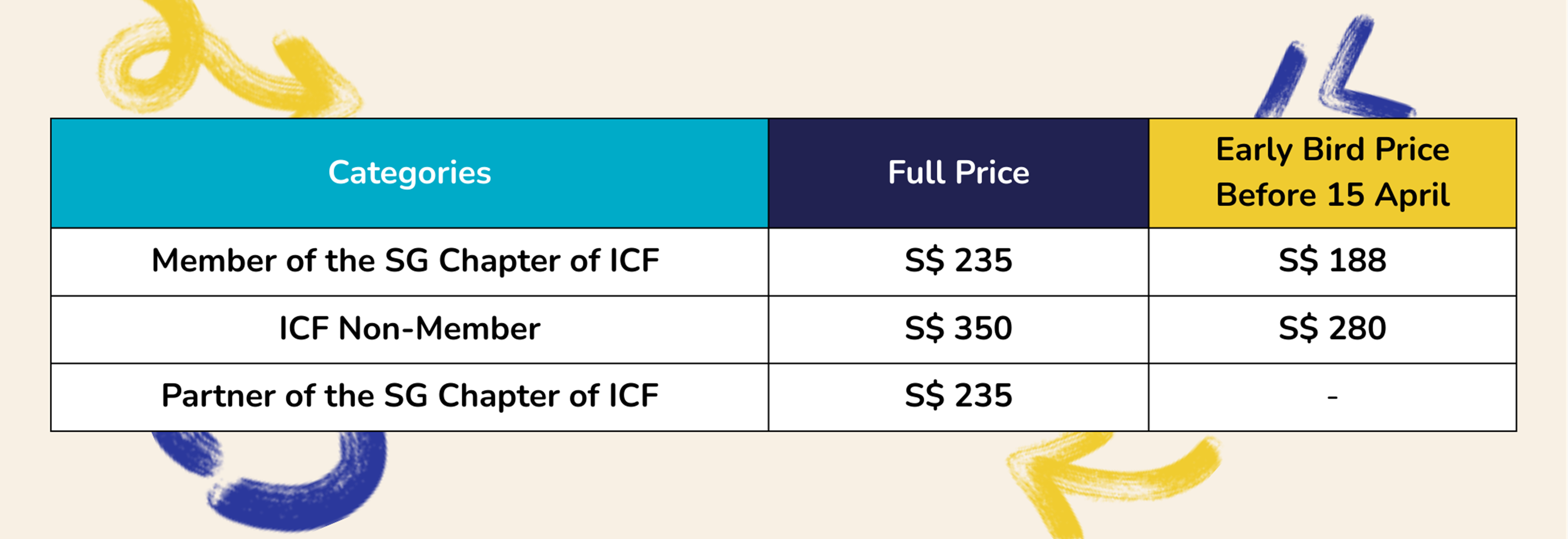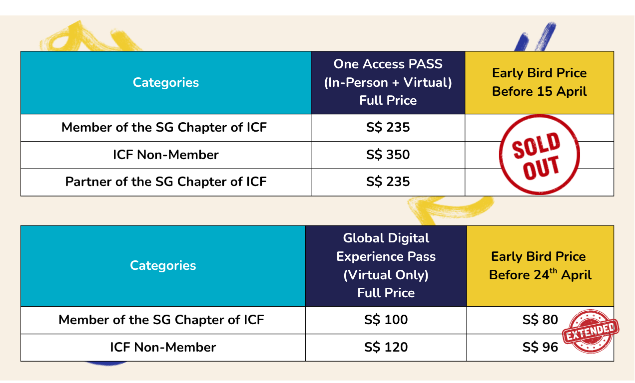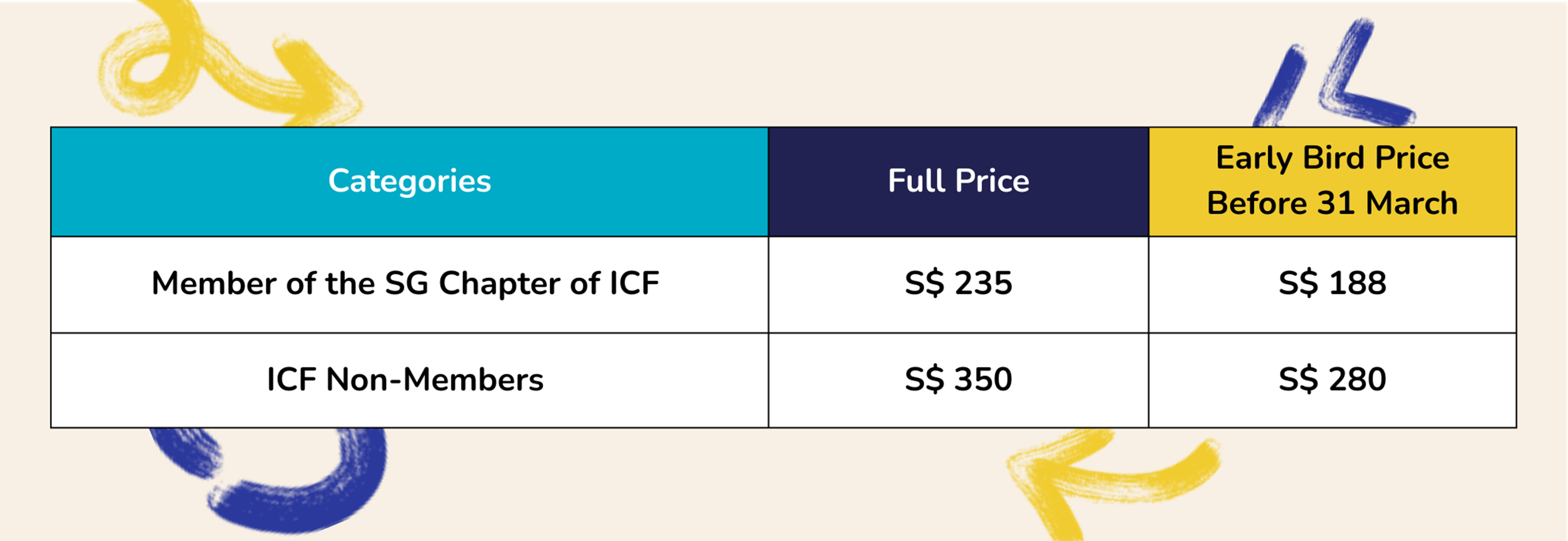 Volunteer Ambassadors of the Singapore Chapter of ICF enjoy a special registration rate in recognition of their contribution to the chapter and the coaching community. Ticketing details for the ambassador rate will be shared separately with volunteer ambassadors.