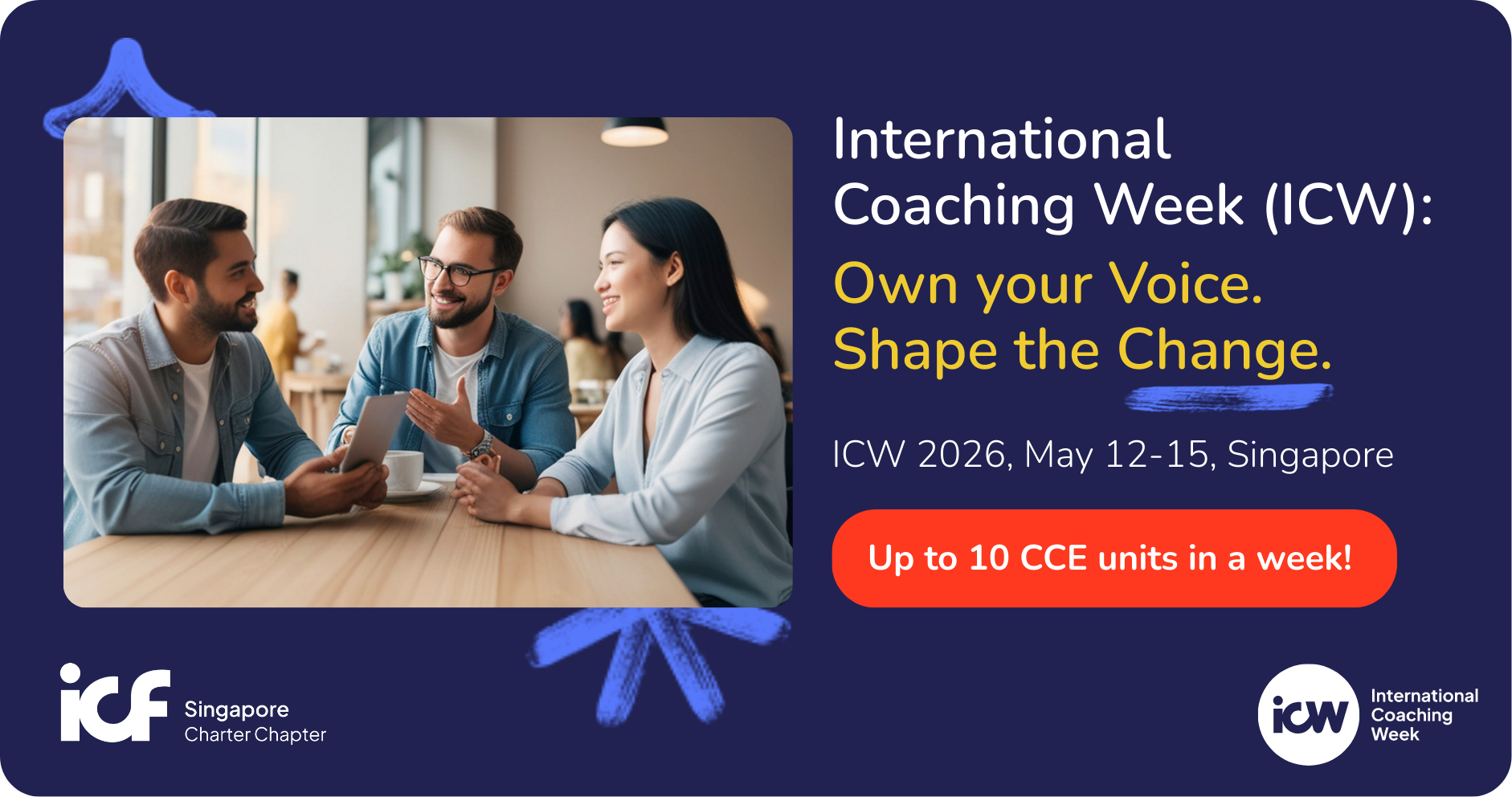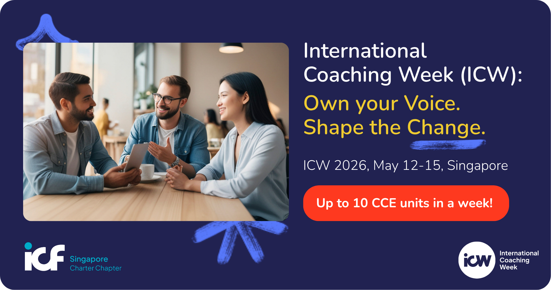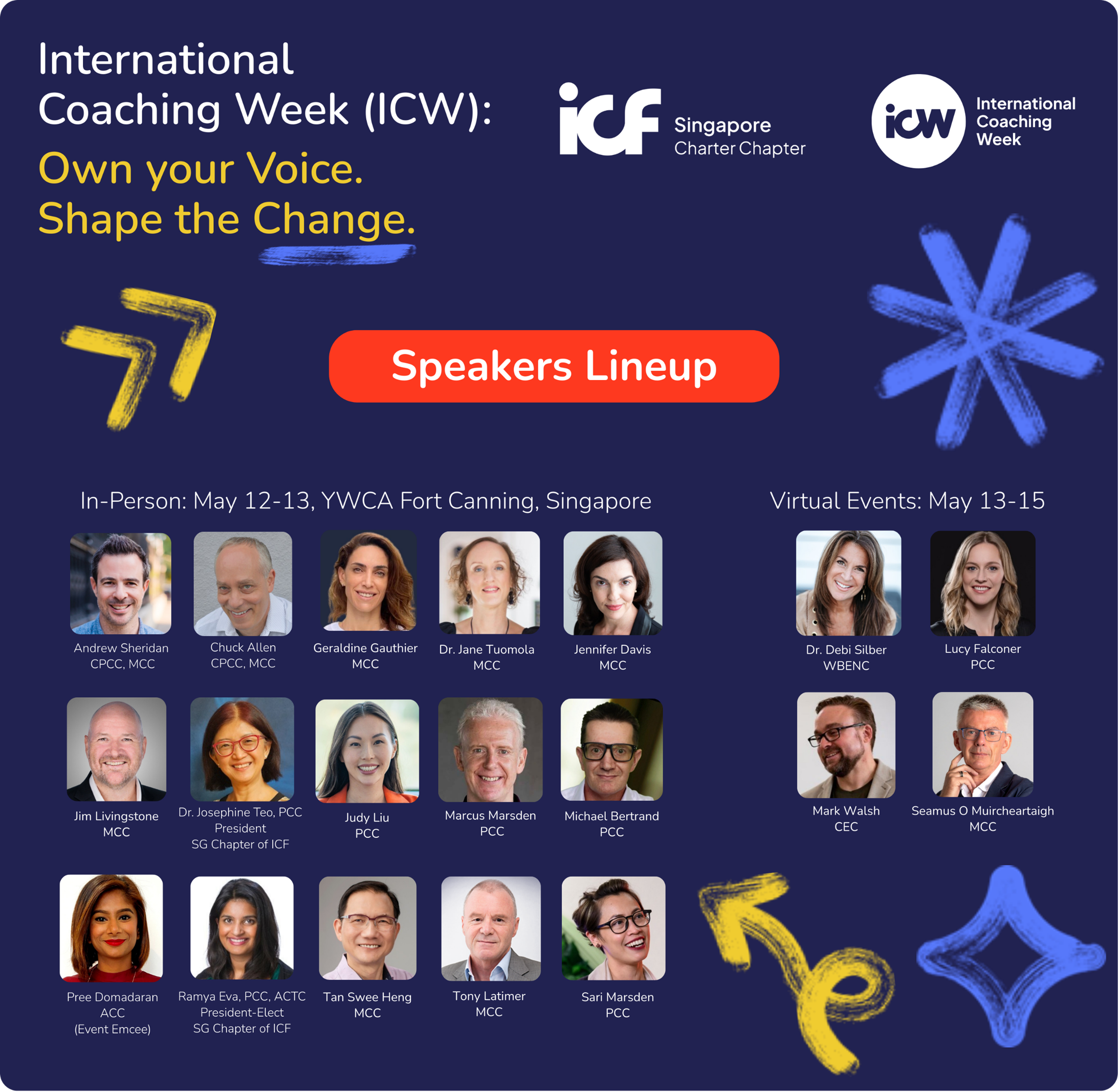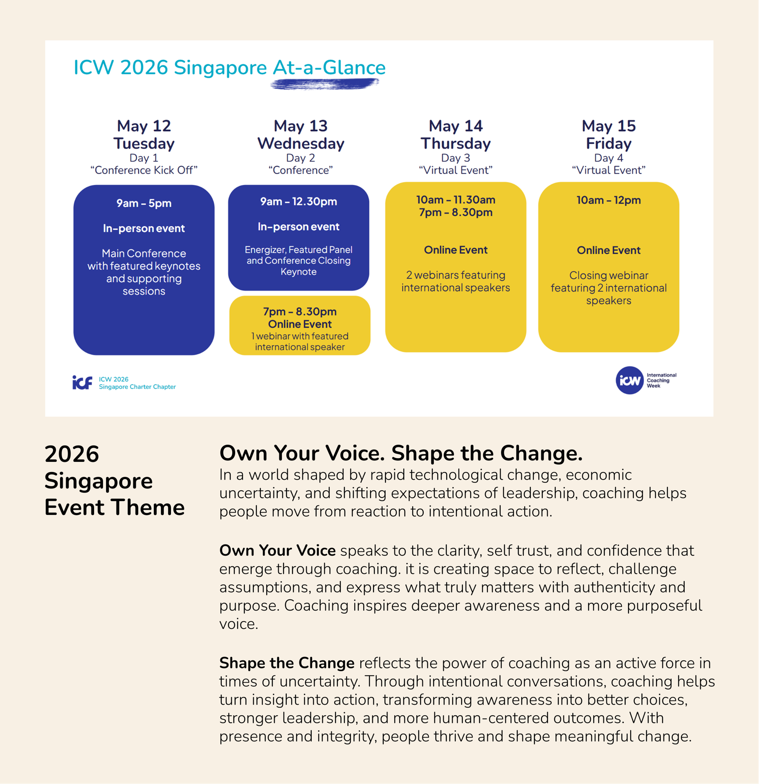 International Coaching Week is an opportunity for individuals and organizations to experience the transformative impact of coaching globally. Throughout the week, the Singapore Chapter of ICF will bring together the coaching community through a series of events designed to introduce coaching, deepen understanding, and showcase how coaching supports growth and development.